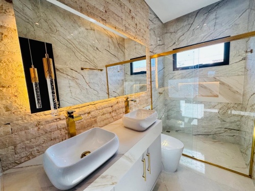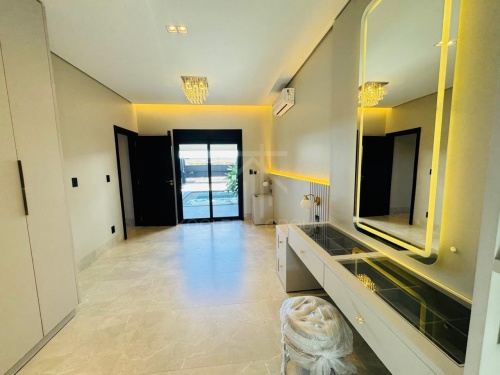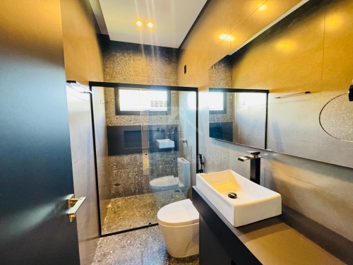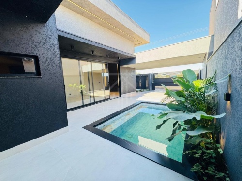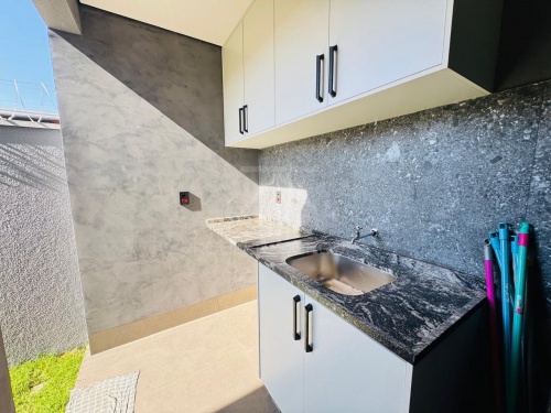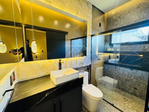 CASA COM ACABAMENTO DE ALTO PADRÃO COM PISCINA, FORRO EM GESSO E PISO PORCELANATO, ILUMINAÇÃO EM LED, CASA COM 3 SUÍTES, SALA COM PÉ DIREITO ALTO, COZINHA GOURMET COM CHURRASQUEIRA, BANCADA, ILHA E MÓVEIS PLANEJADOS, LAVABO, ÁREA DE SERVIÇO, GARAGEM PARA 2 CARROS, PORTAS E JANELAS EM ESQUADRIAS EM ALUMÍNIO, PERSIANAS, AUTOMATIZADAS, SOM ACÚSTICO NO ESPAÇO GOURMET, AR CONDICIONADO NOS QUARTOS, SALA E COZINHA, PLANEJADOS PAINEL DA SALA, COZINHA, NAS SUÍTES, HALL DOS QUARTOS E BANHEIROS.